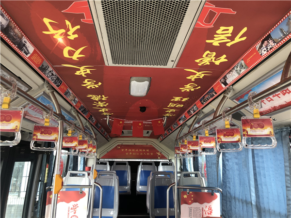丰富车厢文化,营造宣传氛围。以党史学习教育为契机,倡导全民参与,让红色文化充盈整个车厢。车身外窗位置张贴“学党史、悟思想、办实事、开新局”等标语;车厢顶部“学史明理、学史增信、学史崇德、学史力行”等标语格外醒目;风道、拉手等醒目位置以时间轴等方式展示了中国共产党历次重大事件图片和中共一大至十九大的伟大历史图片;以群众耳目一新和喜闻乐见的方式,积极传播党史学习教育好声音。