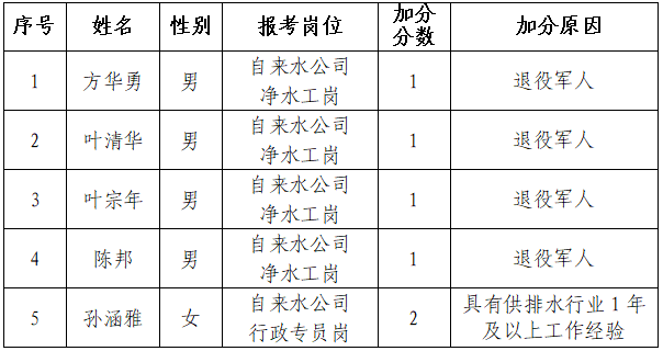 根据《乐鱼官方端网站登录入口-乐鱼(中国)招聘公告》规定,“对报名参加自来水公司净水工岗位的考生如满足退役军人身份给予综合成绩加1分,荣获个人三等功以上的退役军人给予综合成绩加2分,具有供排水行业1年及以上工作经验者给予综合成绩加2分。对报名参加自来水公司行政专员岗位的考生如具有供排水行业1年及以上工作经验者给予综合成绩加2分”。现对报考人员申请加分的审核工作已全部结束,经审核符合加分条件的人员共5人,现予以公示,接受社会监督。公示时间为2020年11月13日—11月15日。公示期间,如对加分情况有异议,请向黄山市徽投集团反映。公示期满后,如无异议的,按规定程序办理加分手续,逾期不再补办。联系电话:0559-6525368,15665592628。