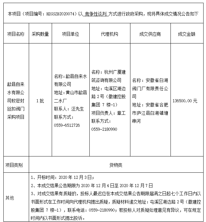 歙县自来水有限公司软密封丝扣阀门采购项目 成交结果公告