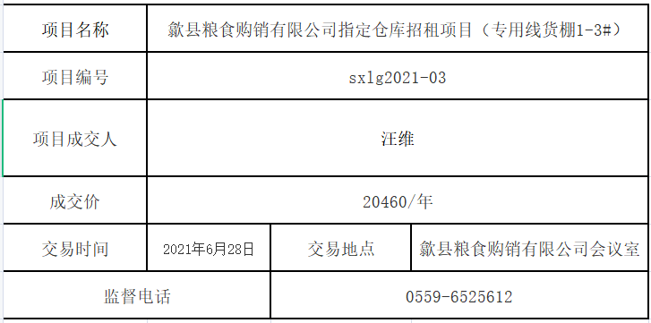 歙县粮食购销有限公司指定仓库招租项目成交公告