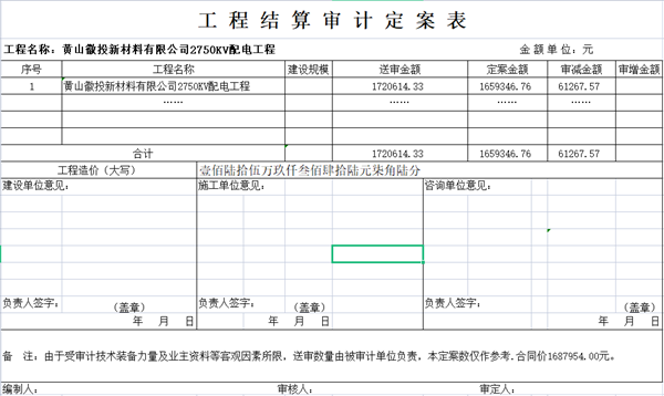 黄山徽投新材料有限公司2750KV配电工程结算审核定案公示