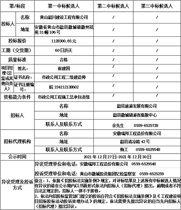 安徽瑞邦工程造价有限公司歙县旅游发展有限公司的委托,对歙县雄村景区码头提升项目AHRBGC2021S12003)进行发包,本项目于202112279时00分安徽瑞邦工程造价有限公司开标、评标,现根据有关法律、法规要求,对中标候选人进行公示。