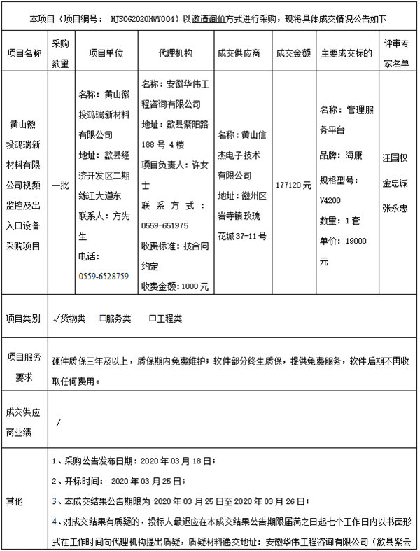 黄山徽投鸿瑞新材料有限公司视频监控及出入口设备采购项目成交结果公告