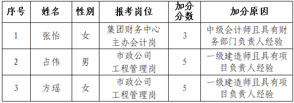 根据《乐鱼官方端网站登录入口-乐鱼(中国)招聘公告》(2020年7月23日)规定,“对报名参加主办会计岗位的考生如持有中级会计师及以上证书且具有财务部门负责人经验的(任职企业的注册资本需为1千万元及以上),给予总成绩3分的加分。对报名参加工程管理岗位的考生如持有一级建造师证书,给予总成绩2分的加分;如持有一级建造师证书且具有项目部负责人经验的(任职企业的注册资本需为1千万元及以上),给予总成绩5分的加分”。现对报考人员申请加分的审核工作已全部结束,经审核符合加分条件的人员共3人,现予以公示,接受社会监督。