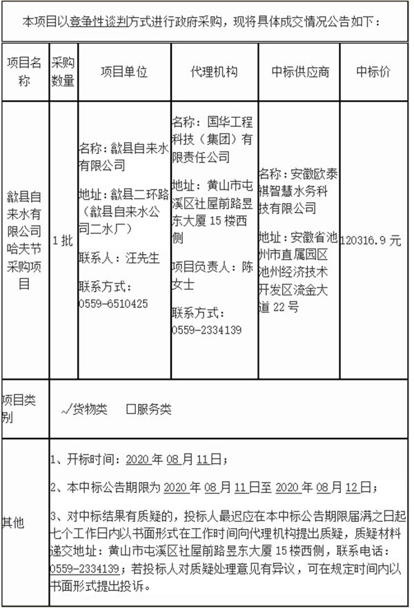 歙县自来水有限公司哈夫节采购项目 成交结果公告