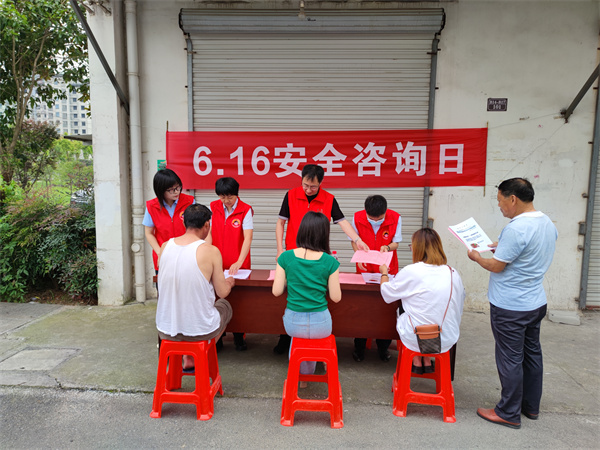 一大早,大家穿起红马甲,准时来到古溪安置区,在小区的主入口,拉起“6.16安全咨询日”横幅,抬出小桌子,摆上各类安全知识宣传资料。活动紧紧围绕“遵守安全生产法 当好第一责任人”的主题,对来来往往的小区居民发放宣传册,还上门入户发放防汛、防火、防诈骗等一封信和现场接受居民的安全知识咨询,现场为小区居民耐心讲解关于安全防汛、防灾减灾、消防安全、防电信网络诈骗、安全生产十五条措施等安全防范知识,整个活动共计发放宣传手册300余份。