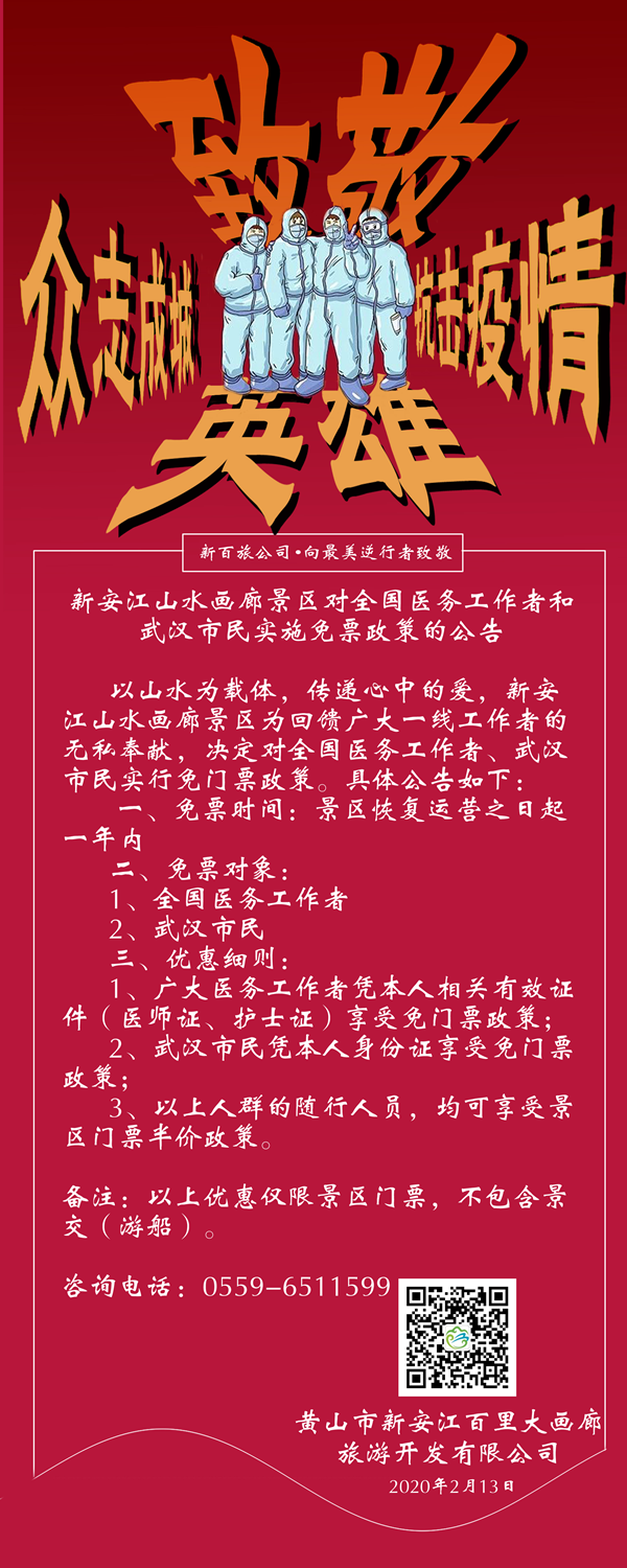 为了表达对广大医务工作者的感谢,新安江山水画廊景区承诺:全国医务工作者及武汉市民全年门票免费,导游陪伴!