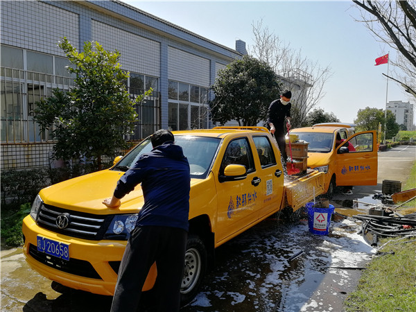 中午,歙县二水厂上空阳光和煦,四辆供水工程车准时集结,7名团员青年对车辆进行集中清洗。青年们撸起袖子干得热火朝天,将各部门的工程车从里到外洗的锃亮,为保持供水车辆干净整洁形象出一份力。